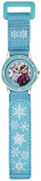 Frozen kids watch with 33mm Anna and Elsa dial, silver metal casing, 3-hand analogue display with time-teaching feature, and fabric strap with velcro fastening.