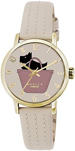 This slim-line ladies Radley Border watch has a PVD gold plated case and is powered by a quartz movement. It is fastened with a cream leather strap and has a cream dial.