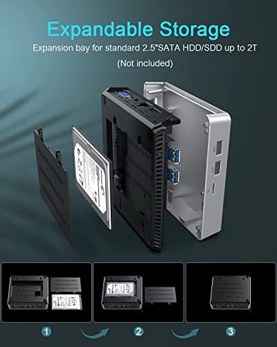 [Storage Expansion]—The mini computer comes with 8 GB of DDR3 and 128 GB of eMMC storage,You can also expand the storage by adding 2.5-Inch sata SSD(up to 2TB) or insert SD Card to speed up the performance.Sufficient capacity result in a fast and highly responsive user experience, providing enough storage space for the daily office.